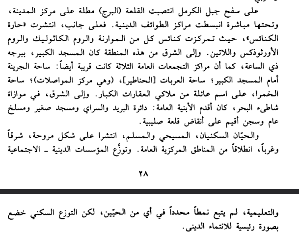 on top of the Carmel mount a fortress is built, which overlooks the city center. Beneath the hill, stretch the religious centers. On the side, lies the Churches neighborhood (haret al kanayes), where we find the Maronite, Catholic and Orthodox church. On the east of this point, we find the big mosque with its clock tower. In addition, near by lie the three public centers: Al Jureneh square in front of the Big Mosque; the Carriages square (Al Hanateer square) and Al Khamra squre, named after a wealthy local family. On the east, parallel to the beach, the oldest public buildings stand: the mail office, the Saray, a small mosque, a slaughterhouse, and a prison built on an old crusade fortress.