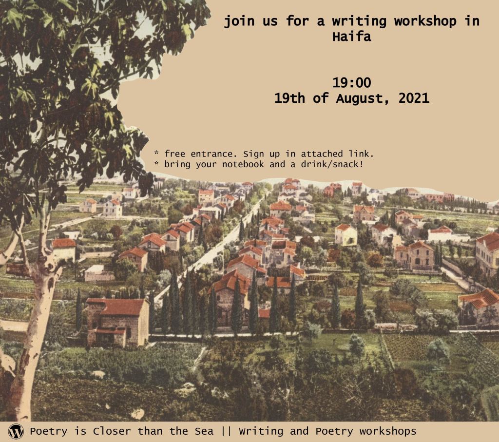 This Thursday (19th of August, 2021), we met on the roof in Masada st 38 in Haifa. We talked, got to know each other and did writing exercises that I’ve prepared earlier. We did 4 writing exercises: 1- stream of consciousness (writing for 7 minutes without stopping). 2- describing a space through smells, sounds and visuals. 3- intense physical [re]experience. 4- write a love poem to an object in your life.